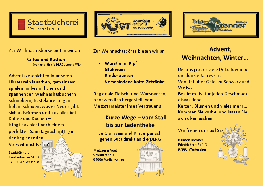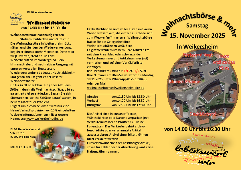 Die DLRG Weikersheim lädt Sie herzlich zur Weihnachtsbörse 2025 ein! Am Samstag, den 15. November 2025, von 14:00 bis 16:30 Uhr können Sie im DLRG-Heim in der Schulstraße 11 in Weikersheim Weihnachtsdekoration tauschen, entdecken und so den Weihnachtszauber auf umweltfreundliche Weise genießen. Vielleicht finden Sie genau das, was Ihre Weihnachtskiste perfekt ergänzt – und helfen dabei, Ressourcen zu schonen.